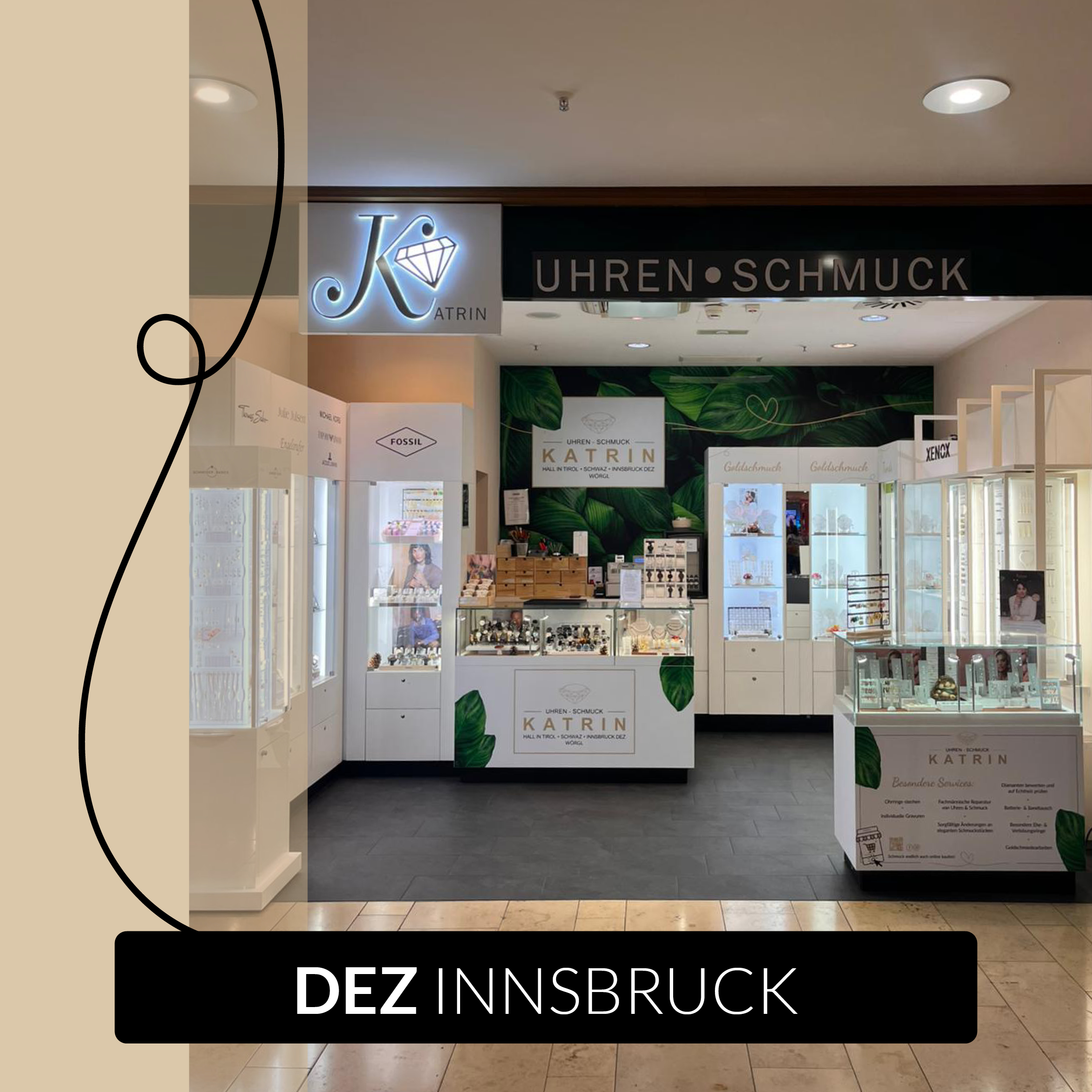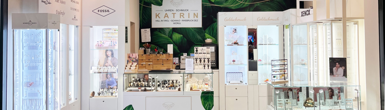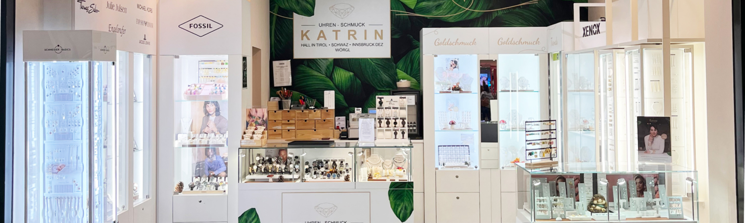 Das im Jahr 2015 eröffnete Uhren & Schmuck Katrin im Einkaufszentrum DEZ in Innsbruck erwartet Sie in einem trendig-modernen Flair. Abgestimmt auf die Wünsche unserer Kunden präsentieren wir Trendmarken von Auranto, Xenox, Schneider, Ice Watch, Thomas Sabo, Julie Julsen, Armani, Fossil, Michael Kors, Gemini, Marina Garcia, Katrins, Nomination, Lucky Chain und FlikFlak. Entdecken Sie Klassiker wie traditionelle Schutzengel-Anhänger, Taufschmuck aus Gold und Silber sowie Kinderohrringe und anderen Kinderschmuck.
